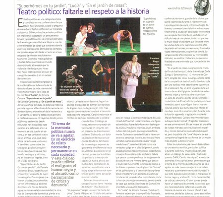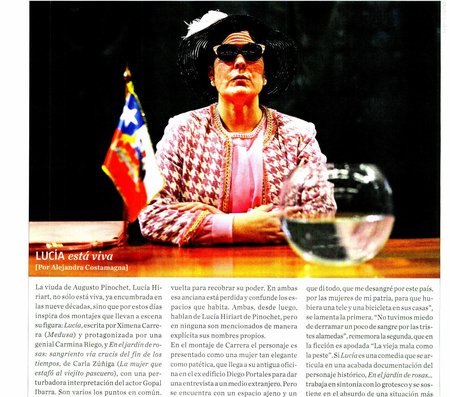 Lucía, escrita por Ximena Carrera, muestra la soledad, vejez y delirio de una mujer que tuvo un poder ilimitado durante 17 años para desde ahí dialogar con el arquetipo de la mujer de dictador, que tiene ejemplos históricos como Nadia de Stalin y Clara de Mussolini, junto con grandes referentes literarios como Lady Macbeth.