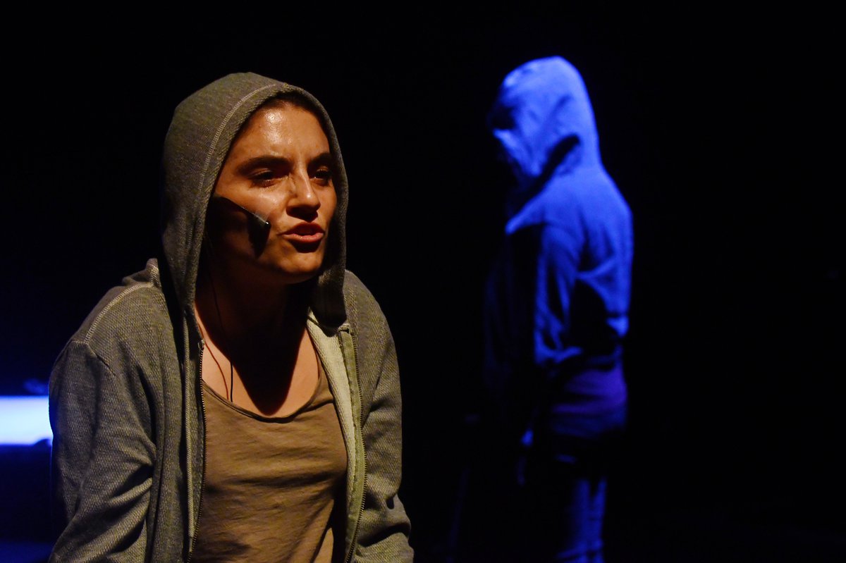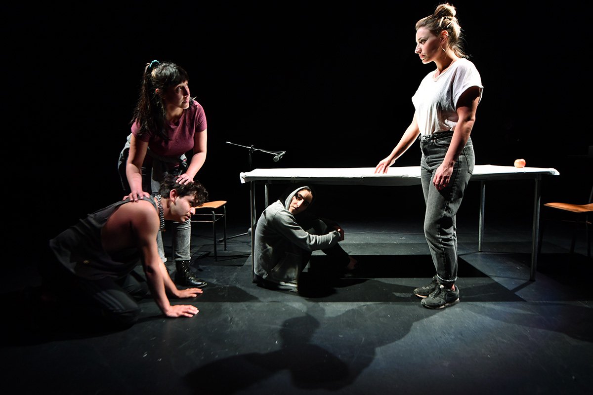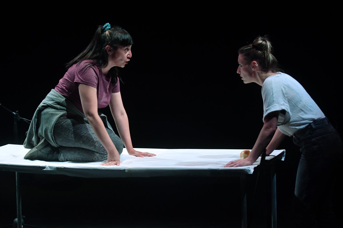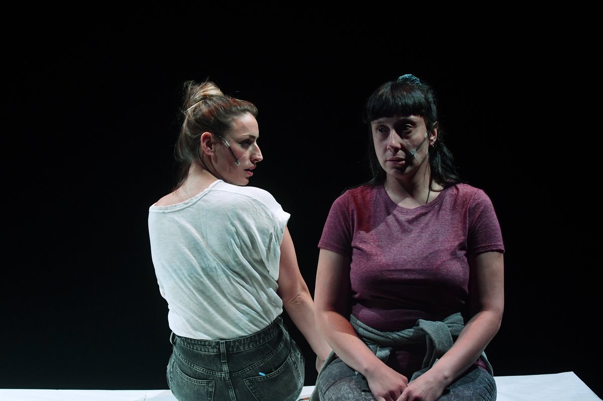 A través de un dispositivo escénico-sonoro, se proyectan los ruidos y voces que emanan de los cuerpos de las actrices, lo que permite generar una experiencia de “estar en el oír”.
