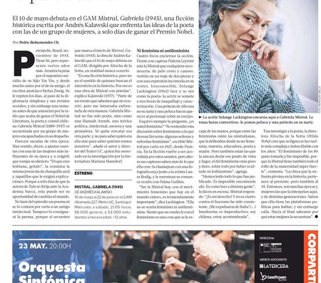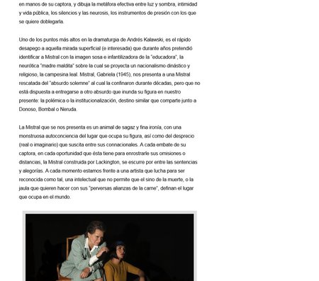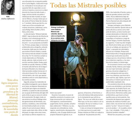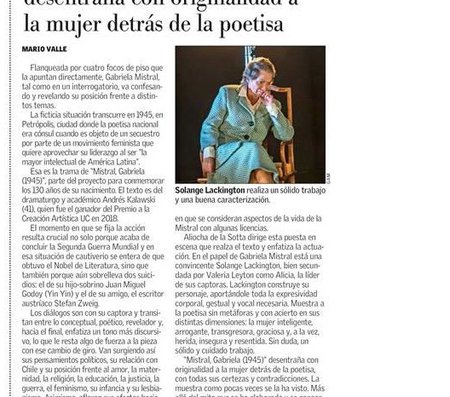 Esto no es una obra biográfica ni un recital de poesía. Nunca quiso serlo. Esto es una ficción imposible, “una obra de Mistral con balazos”. Así se lo planteó desde el inicio Andrés Kalawski, su autor, y así convenció a Aliocha De la Sotta para que la dirigiera, porque ambos aspiraban a lo mismo: explorar las facetas, contradicciones y profundidades que resquebrajan el molde en que se ha presentado a Mistral.