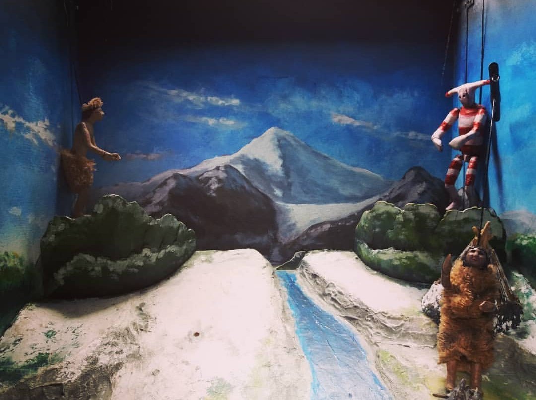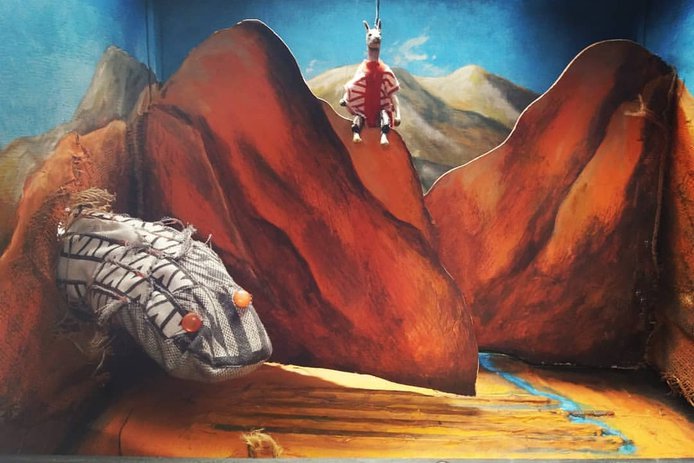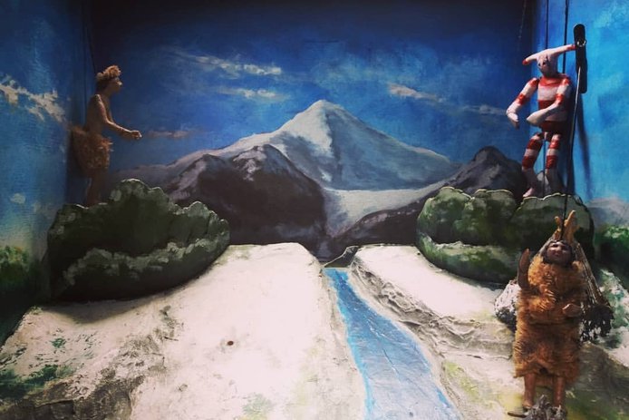 Trilogía de teatro lambe lambe o teatro en miniatura de la Cía. PerroBufo. Tres miniobras escenificadas dentro de cajas que recorren los conceptos de vida, muerte y transformación desde la cosmovisión aymara, mapuche y selknam.