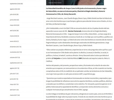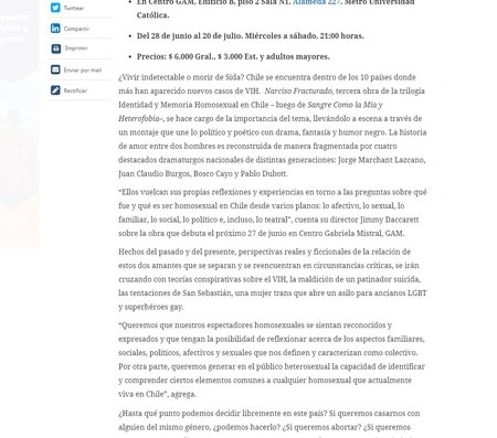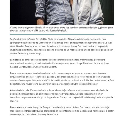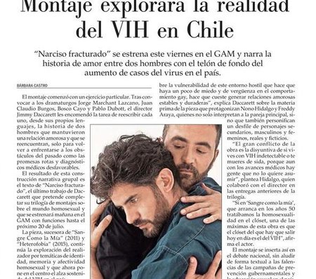 ¿Vivir indetectable o morir de sida? Chile se encuentra dentro de los 10 países con más casos nuevos de VIH. Narciso Fracturado, tercera obra de esta trilogía luego de Sangre Como la Mía y Heterofobia, lleva el tema a escena en un montaje que une lo político y poético con drama, fantasía y humor negro.