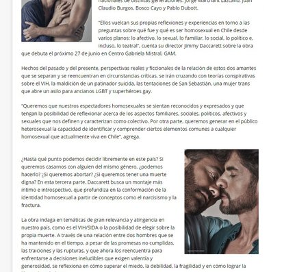 La historia de amor entre dos hombres que se separan y reencuentran en circunstancias críticas es reconstruida de manera fragmentada por cuatro dramaturgos nacionales: Jorge Marchant Lazcano, Juan Claudio Burgos, Bosco Cayo y Pablo Dubott. “Ellos vuelcan sus propias reflexiones y experiencias sobre qué fue y qué es ser homosexual en Chile desde lo afectivo, sexual, familiar, social, político e, incluso, teatral”, cuenta Daccarett.