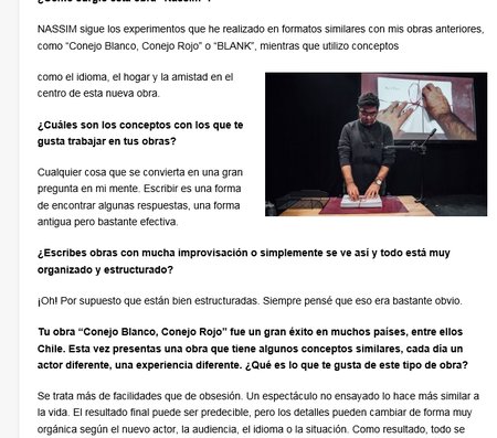 Nassim se estrenó el año pasado en el Teatro Bush de Londres. "Una celebración inusualmente vívida de la vida del teatro”, publicó el diario inglés The Guardian. La obra ganó el premio Scotsman Fringe First y ya se ha presentado en Inglaterra, Escocia, Alemania, Dinamarca, Italia, Corea del Sur, Australia, Canadá, México y Perú.
