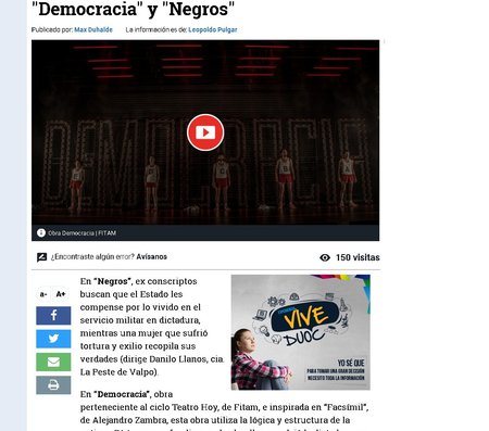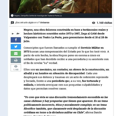 Cinco ex conscriptos del ejército entre 1973 y 1987 buscan una compensación del Estado por lo que les tocó vivir haciendo el servicio militar en dictadura. Una periodista y su asistente les piden sus testimonios para un libro. Ella, que fue torturada y exiliada, con sus preguntas intenta averiguar grados de culpabilidad y datos que permitan resolver casos. Mientras ellos van reviviendo sus traumas. Esto ocurre en Negros, obra del Centro de Investigación Teatro La Peste.