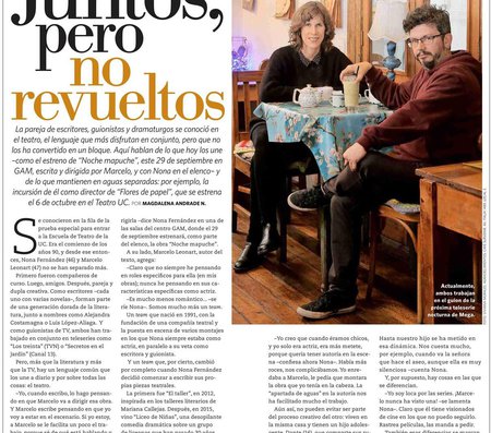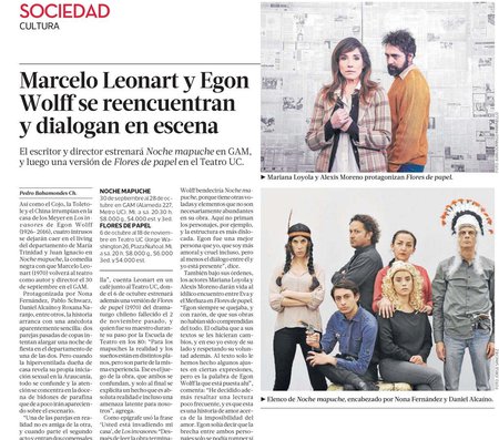 Noche mapuche es la nueva obra de la compañía La Pieza Oscura, formada por Marcelo Leonart y Nona Fernández, con la que han estrenado El Taller (2012) y Liceo de Niñas (2015).
