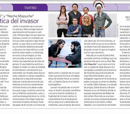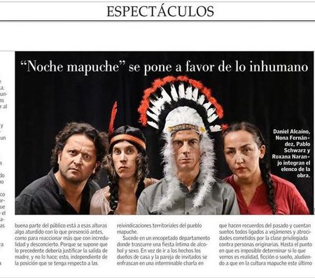 Noche, música bailable, erotismo y alcohol. Dos parejas en un departamento del barrio alto escuchan la historia sexual que la dueña de casa tuvo a los 16 años con un trabajador mapuche del campo de su papá. Un chiquillo de 19 años que metieron sin ropa a su pieza como broma, despertando el deseo, único punto posible de encuentro entre ellos. Ese relato que se calienta, violenta y confunde hasta desdibujar el tiempo y el espacio es Noche mapuche, obra escrita y dirigida por Marcelo Leonart.