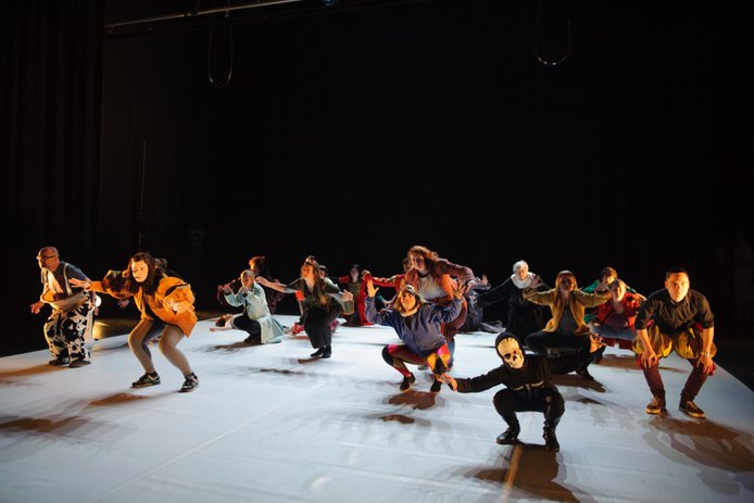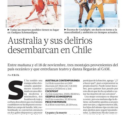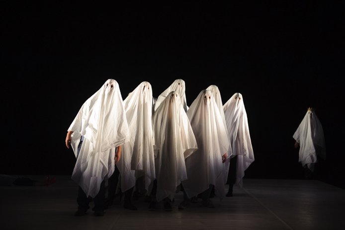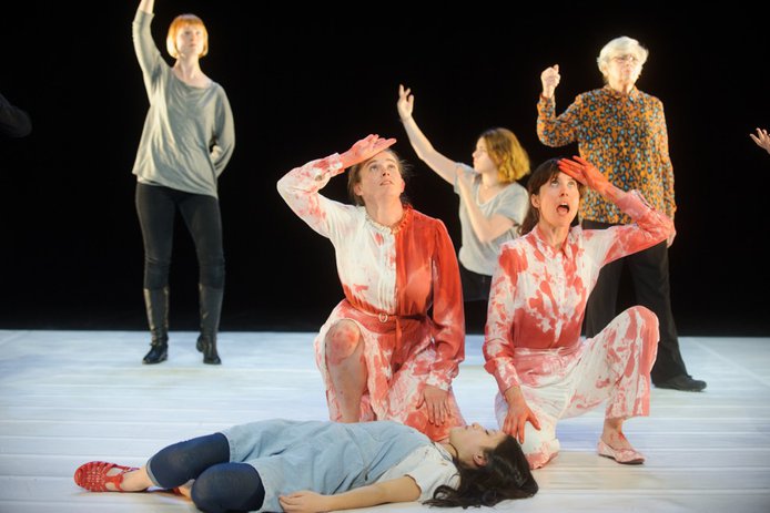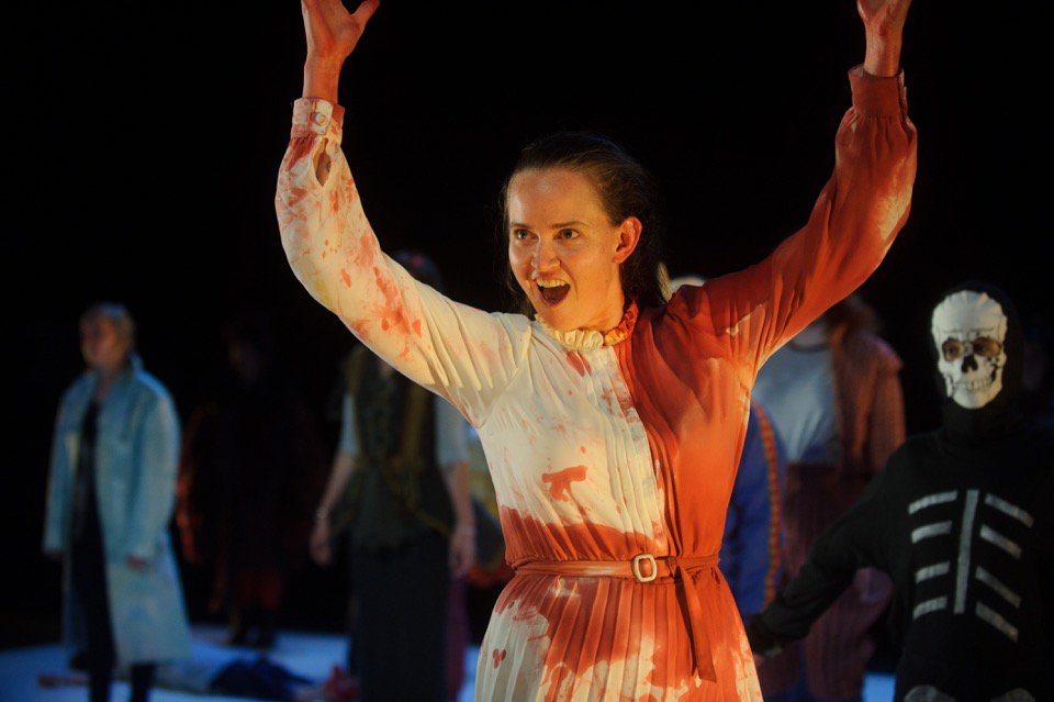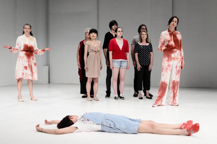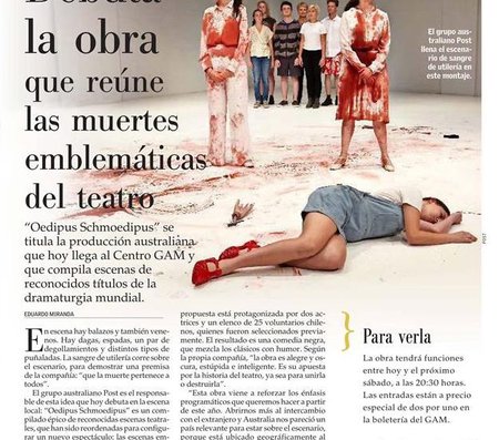 Humor negro y sangre en una obra sobre la muerte, el teatro y la muerte en el teatro. Montaje de la compañía australiana post que sube a escena a dos actrices y un elenco ciudadano de 25 personas.
