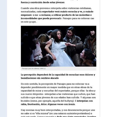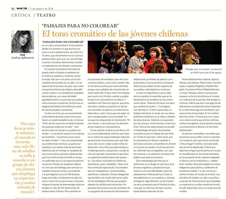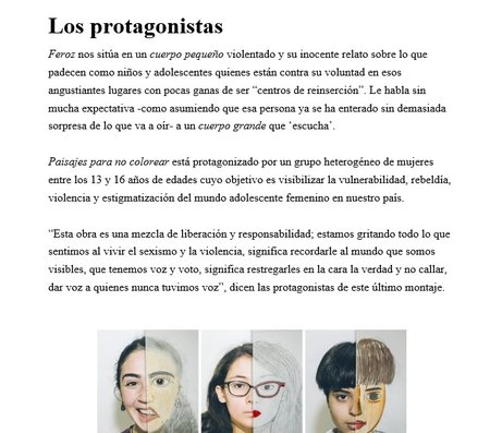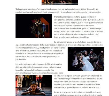 Lissette Villa tenía 11 años cuando murió asfixiada porque una cuidadora de 90 kilos se sentó sobre ella por minutos. Tania Águila murió a los 14 años cuando su pololo la atacó con una piedra en la cabeza. Florencia Aguirre tenía 10 años cuando su padrastro la asfixió con una bolsa, la quemó y la enterró en la leñera de su casa. Estos fueron algunos de los casos que impulsaron al equipo de Teatro La Re-Sentida a crear Paisajes para no colorear, obra en la que un grupo de adolescentes de sexo femenino intenta visibilizar la vulnerabilidad a la que están expuestas por ser “mujeres” menores de edad.