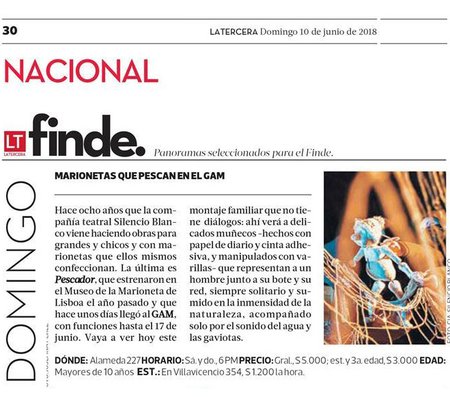En Pescador, una marioneta blanca que protesta el valor y heroísmo de todos a quien representa, se instala ante cinco actores en escena. Un encuentro en todas las formas del silencio.