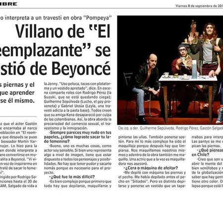 El montaje es interpretado por Rodrigo Pérez, Guilherme Sepúlveda, Gastón Salgado y el ganador al Mejor Actor del Círculo de Críticos por este papel, Gabriel Urzúa.