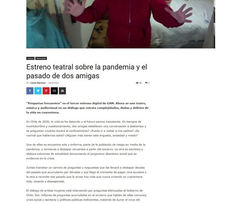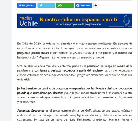 En Chile de 2020, la vida se ha detenido y el futuro parece inexistente. En tiempos de incertidumbre y cuestionamiento, dos amigas establecen una conversación a destiempo y se preguntan ¿cuánto durará el confinamiento? ¿Puedo ir a visitar a mis padres? ¿Es normal que hablemos solos? ¿Alguien más siente esta angustia, ansiedad y miedo?