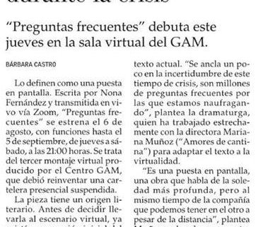 Dramaturgia: Nona Fernández | Dirección: Mariana Muñoz | Elenco: Gabriela Aguilera y Claudia Cabezas | Composición musical y asistente de dirección: Mario Avillo | Composición audiovisual: Niles Atallah | Diseño técnico: Tamara Figueroa AS | Asistente diseño: Roberto Mancilla- Cruz | Producción GAM.