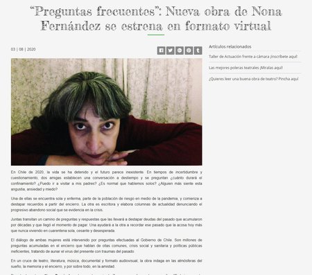 La obra tuvo su estreno el 6 de agosto de 2020 con una temporada hasta el 5 de septiembre y conversatorios post función cada día. Ha circulado también por Chile y en el Festival Internacional de Artes Escénicas Panamá. En 2021 tuvo funciones VOD y se presentó en el Festival Internacional de Teatro del Bíobío.