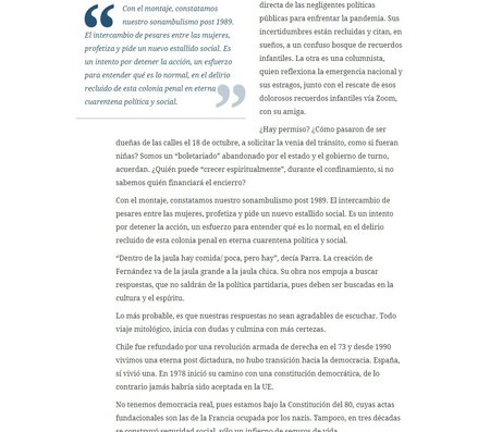 Una de ellas se encuentra sola y enferma, parte de la población de riesgo en medio de la pandemia, y comienza a destapar recuerdos a partir del encierro. La otra es escritora y elabora columnas de actualidad denunciando el progresivo abandono social que se evidencia en la crisis.
