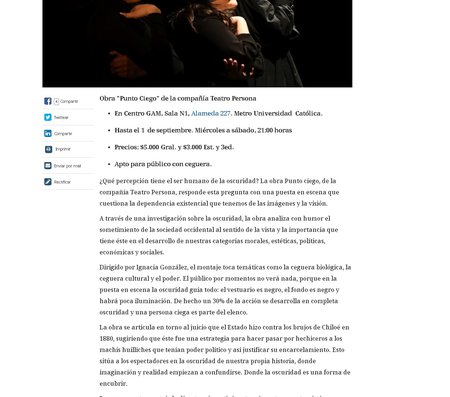 Voy a ver una obra. Esa es la típica frase que dice alguien que va al teatro. Pero los que vengan a Punto ciego, por momentos no verán nada. Esta creación de la compañía Teatro Persona cuestiona la dependencia existencial que tenemos de las imágenes y la visión a través de una investigación sobre la oscuridad. ¿Es ver sinónimo de conocer?