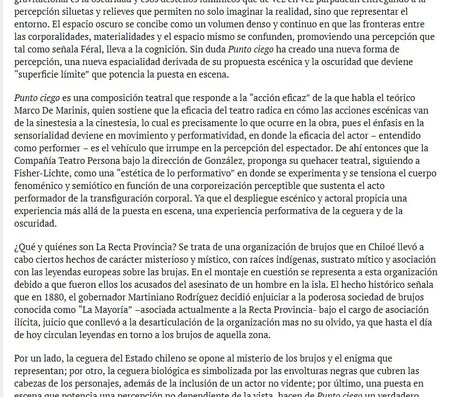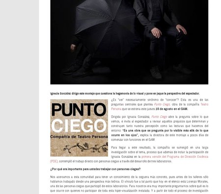 Punto ciego plantea la ceguera biológica como una cultura, valorando su diferencia y entendiendo que tiene su propia forma de percibir y habitar el mundo. Para crearla la directora investigó teoría, hizo entrevistas, entrenamiento de actores y un laboratorio para ciegos. Una persona ciega que participó en el laboratorio es parte del elenco.