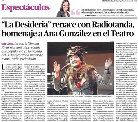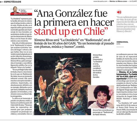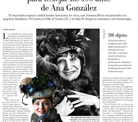 Para Ximena Rivas es “un privilegio haber sido invitada a hacer a Ana González en lo que era Radiotanda. Sin duda Ana es un referente actoral. Ella aunó muchos conceptos teatrales y artísticos. Ella improvisaba, era absolutamente definitiva en su mensaje, disfrutaba con lo que hacía, trabajaba mucho lo popular y lo inmediato y veía al teatro como una fiesta. Entonces es un honor pensar que yo puedo encarnarla y un tremendo desafío”.