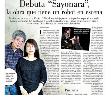 Una androide le recita poemas a su dueña, hija del hombre que la compró. La mujer está triste y la androide le recita versos japoneses, alemanes, franceses, para ver si logra subirle el ánimo. Una está enferma y la otra, defectuosa. Entre los versos se cruzan preguntas y reflexiones que esbozan lo que significa la vida y la muerte para cada una de ellas. Eso ocurre en Sayonara, obra breve japonesa que con su estreno el 2010 marcó un hito al presentar a la primera actriz androide.