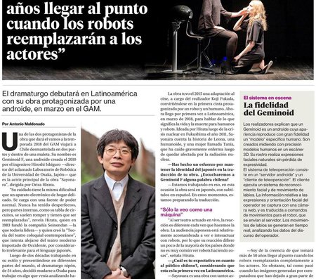 Los asistentes a la función de las 20.30 horas del 23 de marzo podrán participar en el conversatorio Arte y robótica que se hará tras la obra. Estará el propio dramaturgo y director del montaje, Oriza Hirata, conversando con traducción simultánea japonés-español.