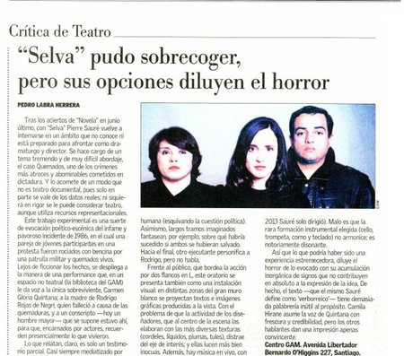 Esta performance teatral es interpretada por Camila Hirane, Carolina Cheuquepán, Mariano Reyes y Gianfranco Bosisio. La obra intenta hacer justicia a través del teatro y se llama Selva “por una analogía a ‘ciudad’. Vivimos en una selva de animales caníbales que se matan unos a otros. Carmen Gloria está tratando de liberarse de esta selva repleta de culpables en libertad”, cuenta Sauré.