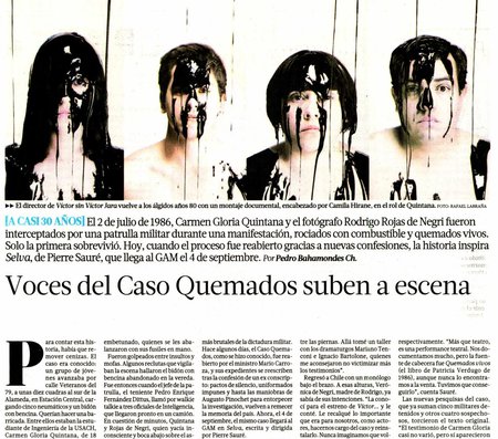 Carmen Gloria Quintana y Rodrigo Rojas de Negri fueron quemados vivos por un grupo de militares en julio de 1986. Pierre Sauré investigó el caso para crear una obra sobre estos hechos. Pero en julio de este año la realidad tuvo un vuelco: El conscripto Fernando Guzmán rompió el pacto de silencio y dio información clave sobre lo que ocurrió. Entonces el texto de la obra también cambió.