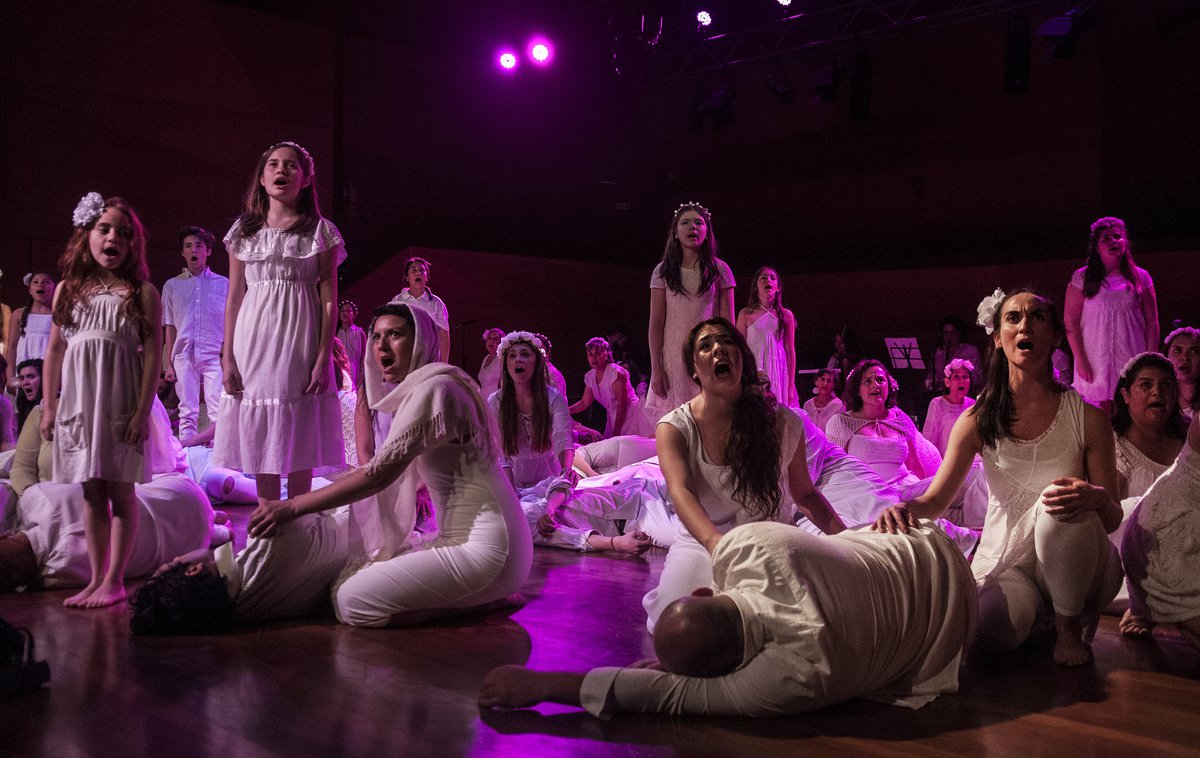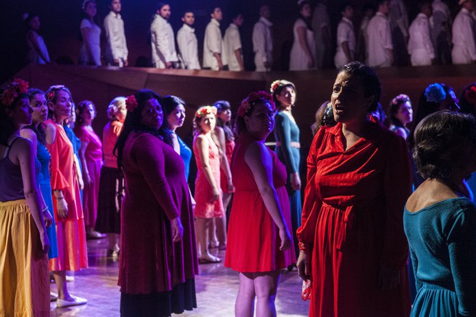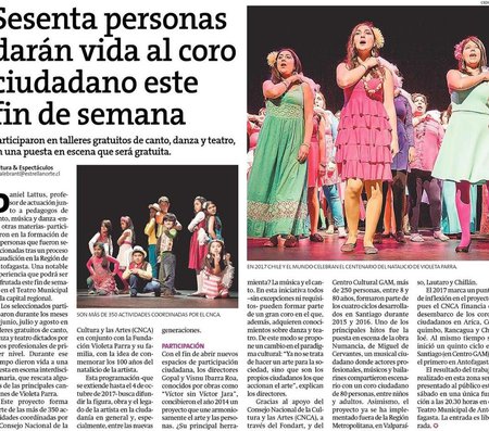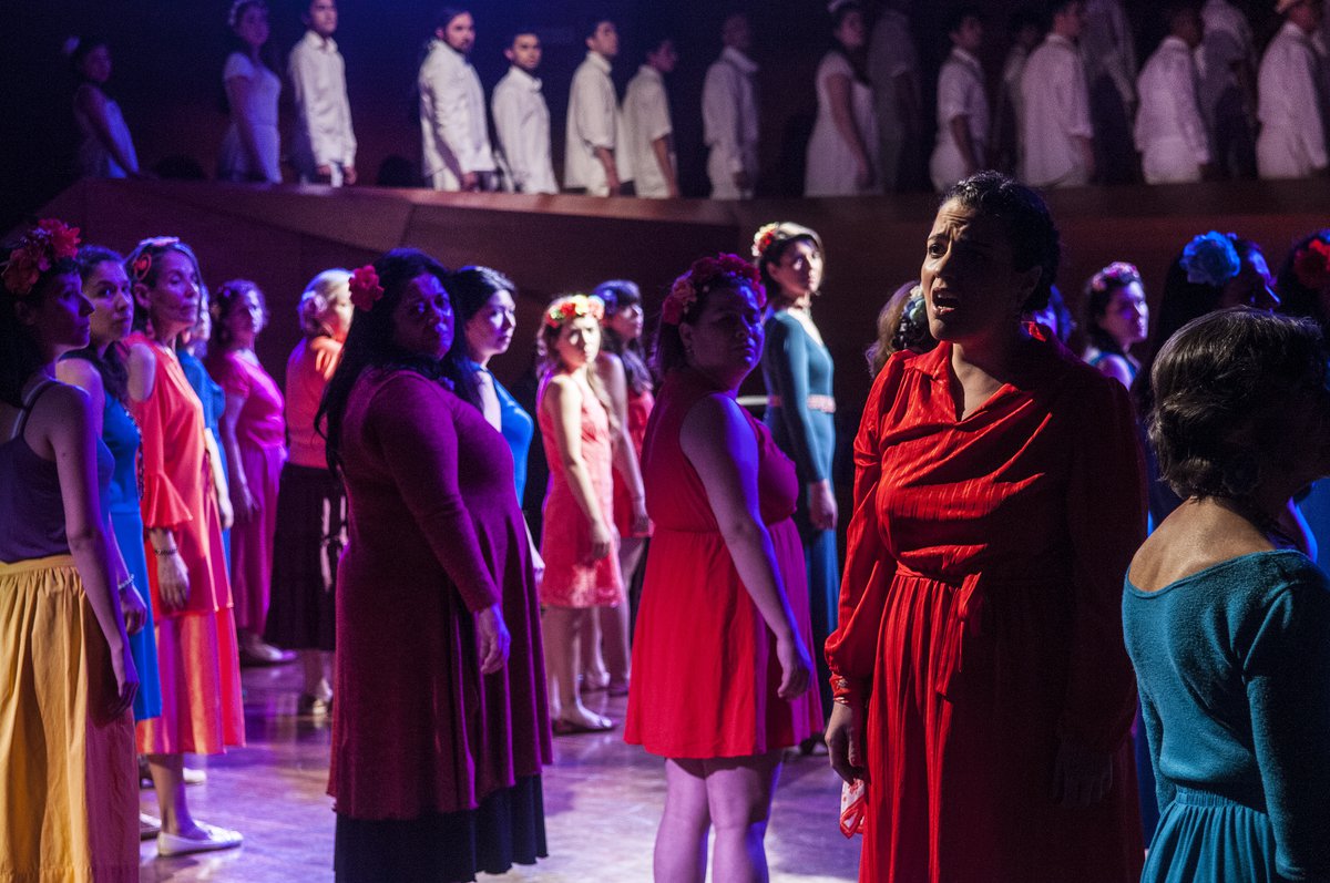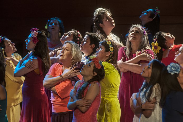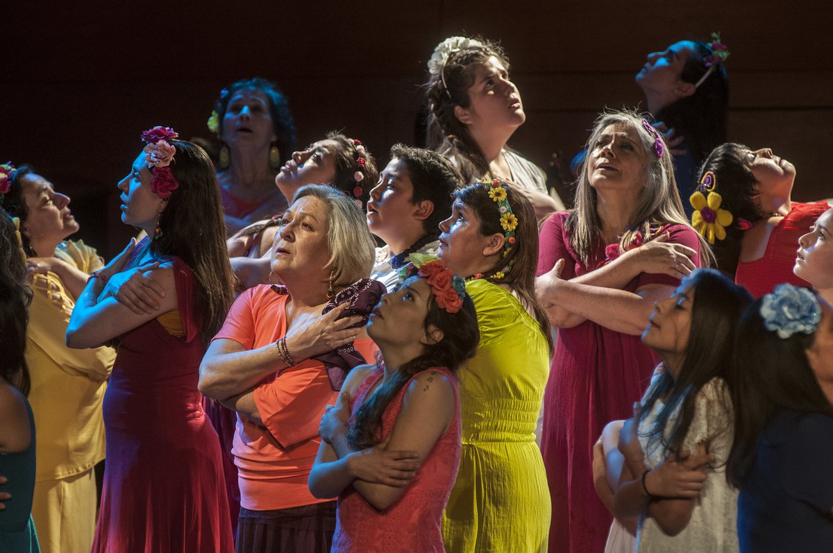 Un coro ciudadano de 100 personas junto a cinco músicos interpretan canciones emblemáticas de Violeta Parra en una obra de teatro musical de los hermanos Gopal y Visnu Ibarra.