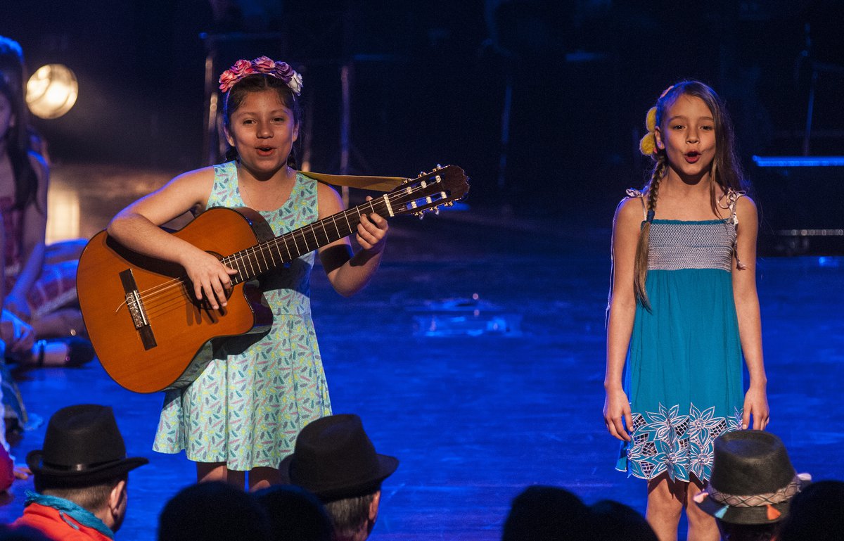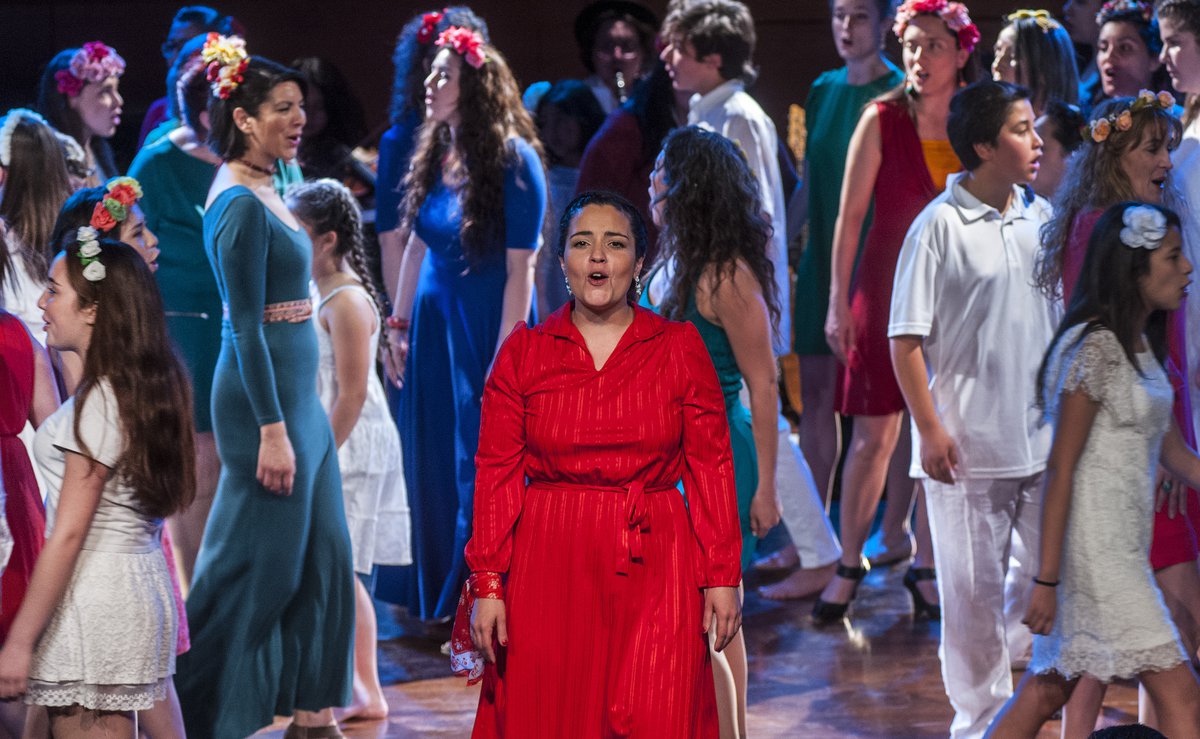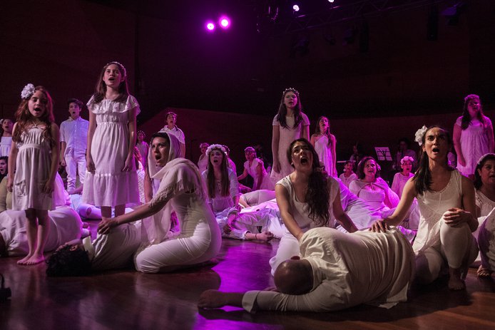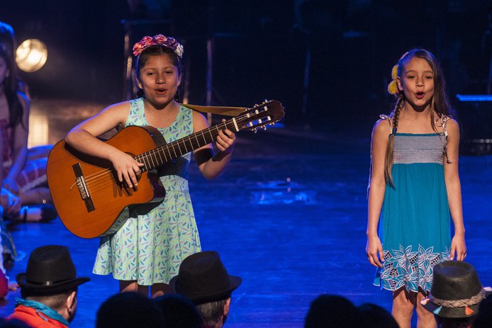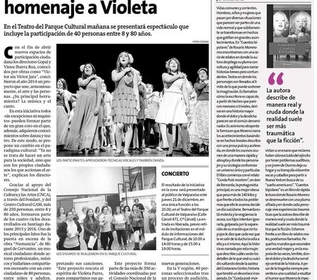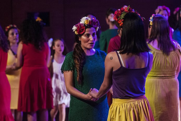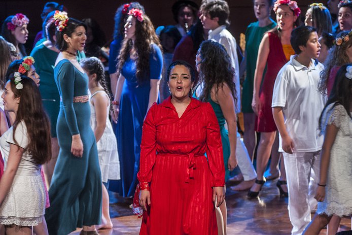 Un coro ciudadano de 100 personas junto a cinco músicos interpretan canciones emblemáticas de Violeta Parra en una obra de teatro musical de los hermanos Gopal y Visnu Ibarra.