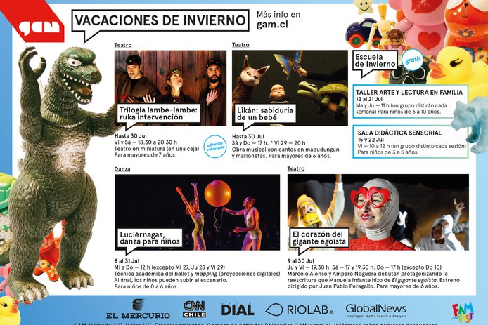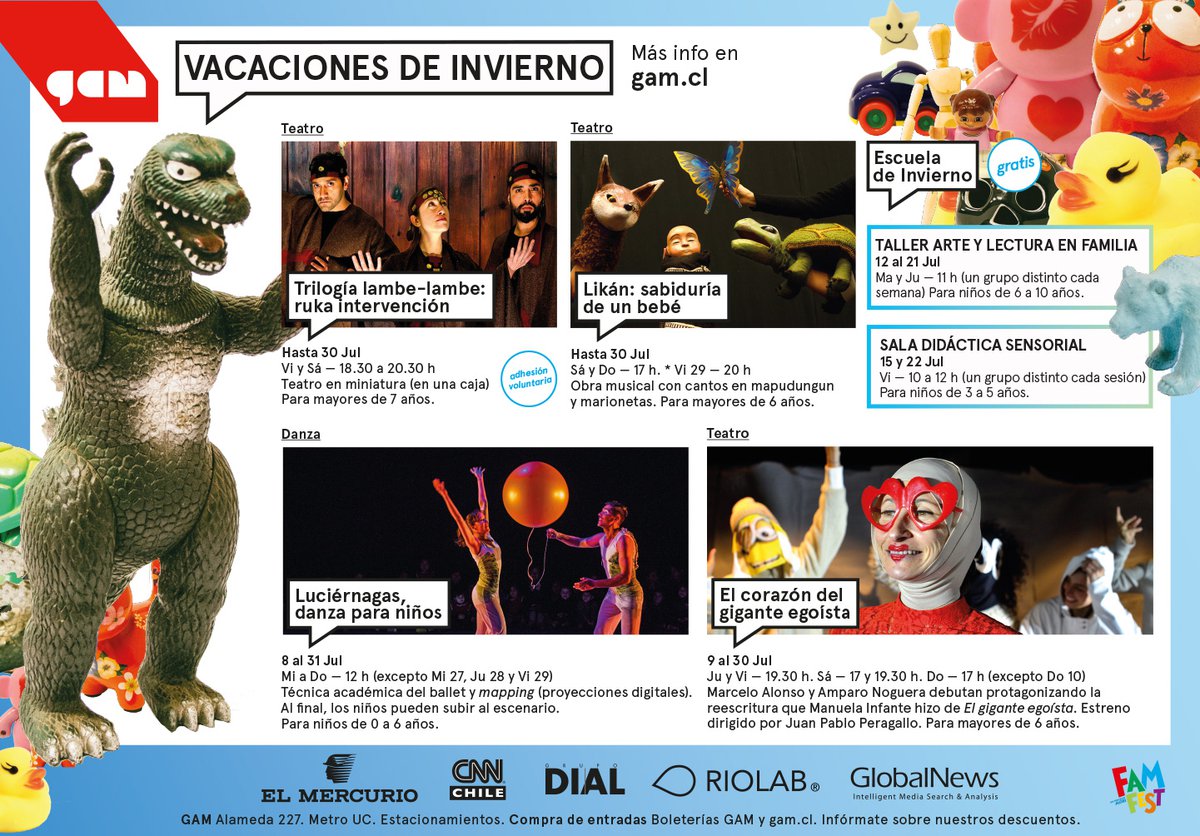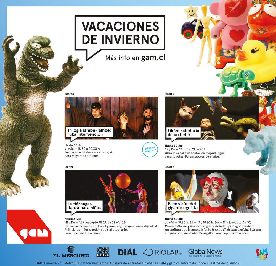 Todos los años, GAM ofrece programación familiar en julio, a propósito de las vacaciones de invierno y por ser sede del FAMFEST. En 2016, se ideó una campaña en torno a esta temática que implicó animar una serie de juguetes y colocarlos sobre fotografías del edificio bajo la consigna “los niños se toman GAM”. La campaña tuvo buena acogida y generó variados comentarios.
