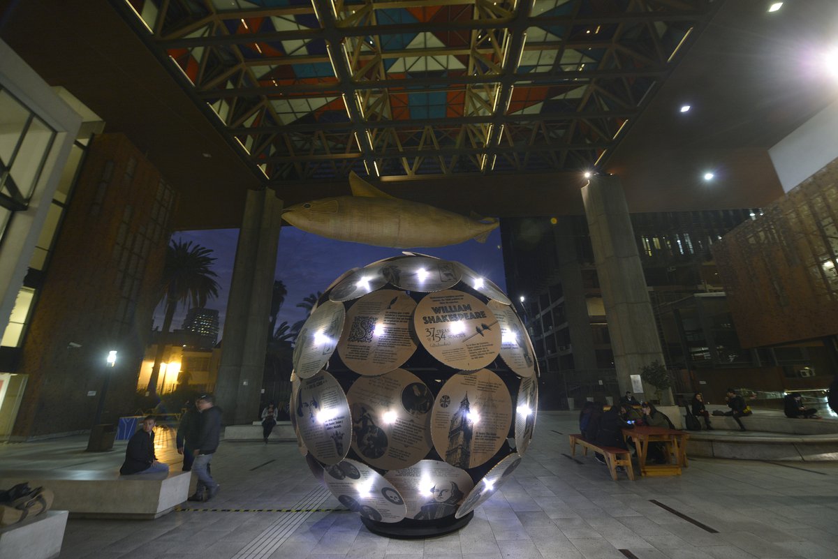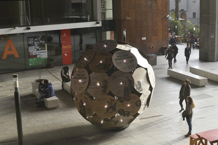 En una esquina de la plaza central del GAM una gran esfera, hecha con círculos de cartón iluminados, se instaló para atraer al público y acercarlo a la figura de William Shakespeare fallecido el año 1616.