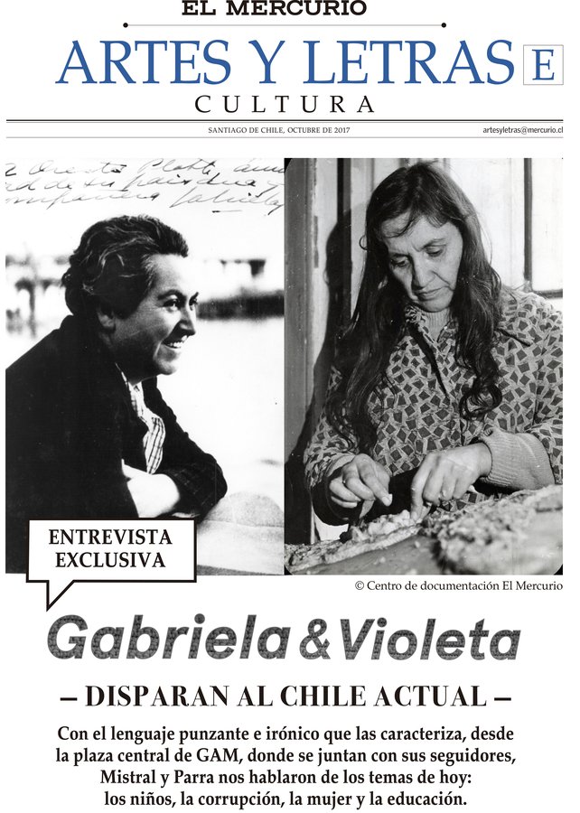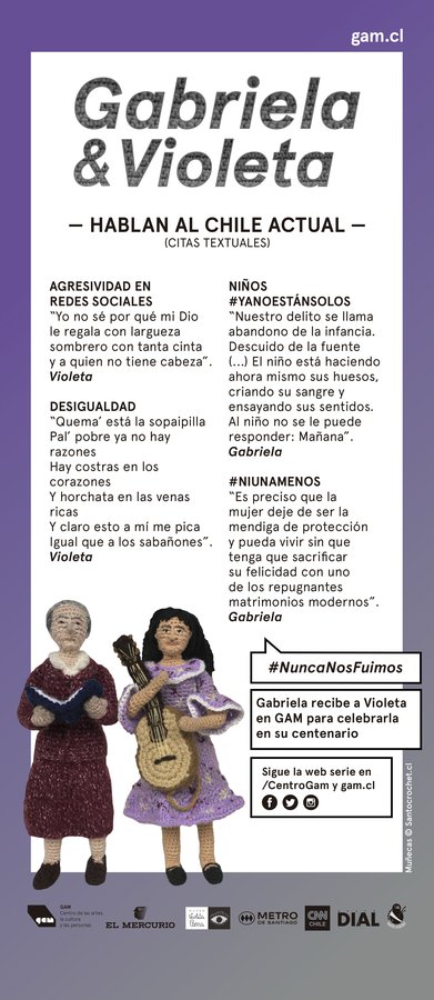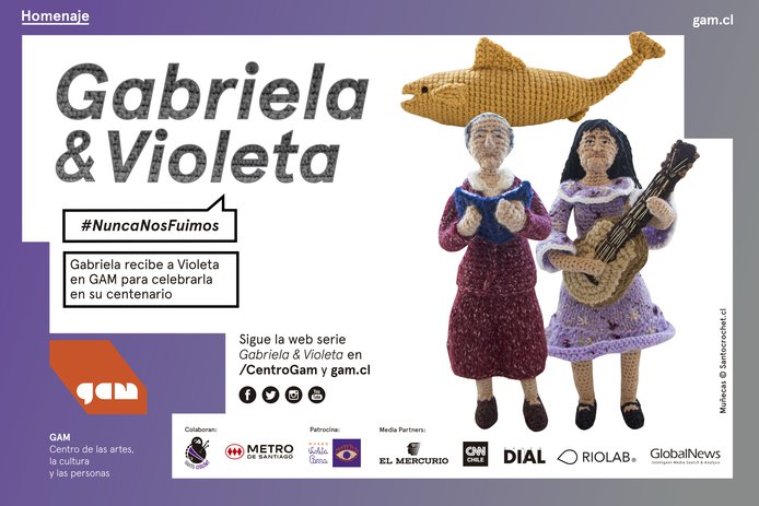 Durante 2017, el equipo de Comunicaciones y Marketing de GAM creó la campaña Gabriela & Violeta, con motivo del centenario de la cantautora chilena. Una curatoría digital y acción de marca que destaca a dos mujeres chilenas, cuyos mensajes son contingentes hoy. Gabriela Mistral recibe a la cantautora en el centro cultural que lleva su nombre (GAM), y la invitó a vivir el Chile de hoy. Las protagonistas, hechas de lana por la diseñadora escénica Macarena Ahumada, recorrieron el edificio y otras locaciones en un viaje por las artes, sus historias y críticas sociales.