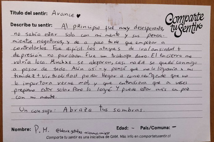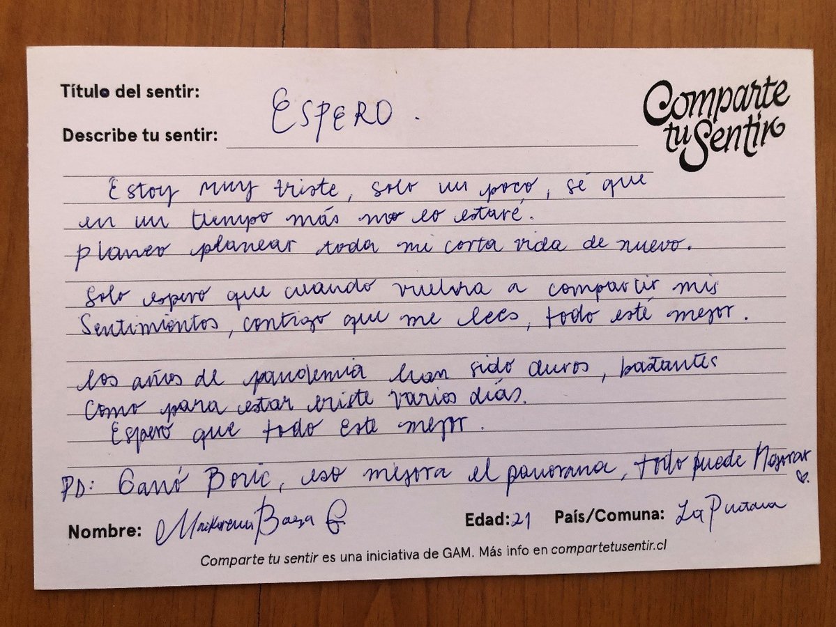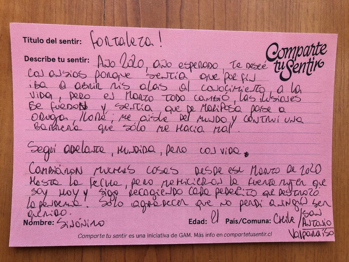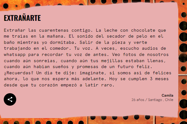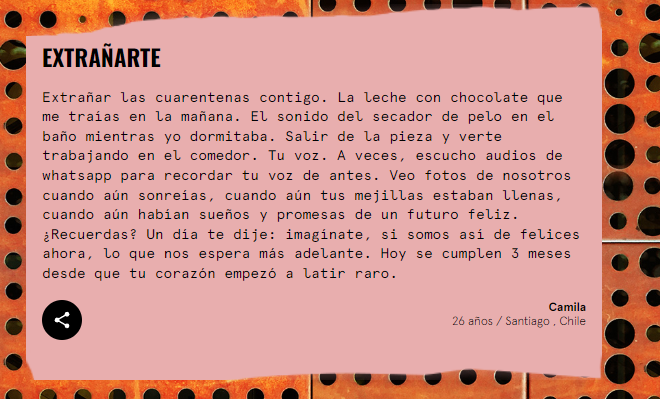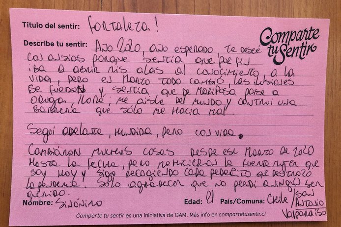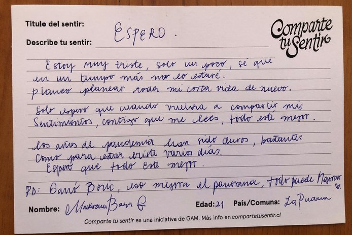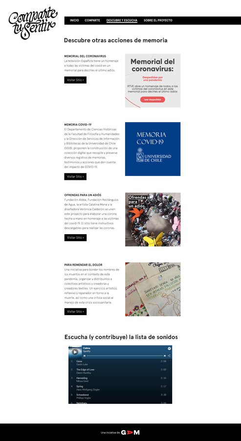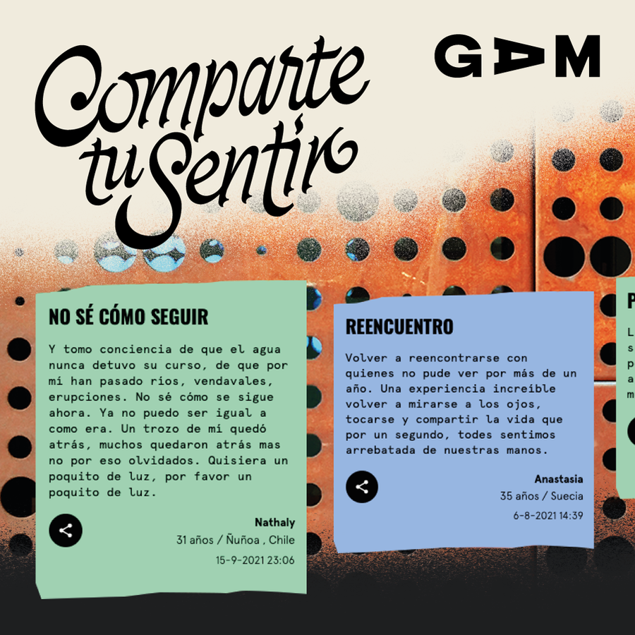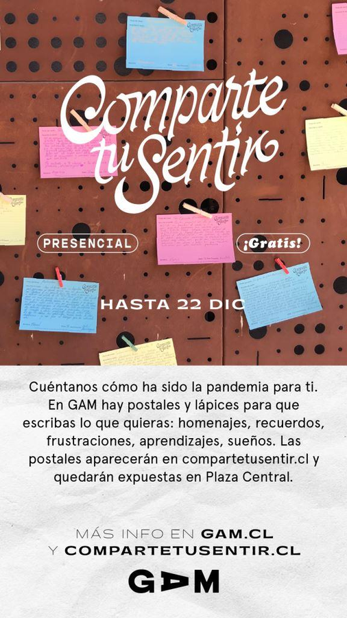 El sitio web se convirtió en un repositorio de historias, una invitación a desahogarnos con lo que no resultó, con los planes que no se pudieron realizar, con los encuentros pospuestos y las costumbres pausadas. También propuso difundir otras iniciativas de memoria Covid-19 y además, una playlist colaborativa en Spotify GAM. En un mes de campaña digital, se escribieron 52 mensajes siendo un 65,4% de ellos provenientes de Santiago, 11 de regiones y uno internacional.