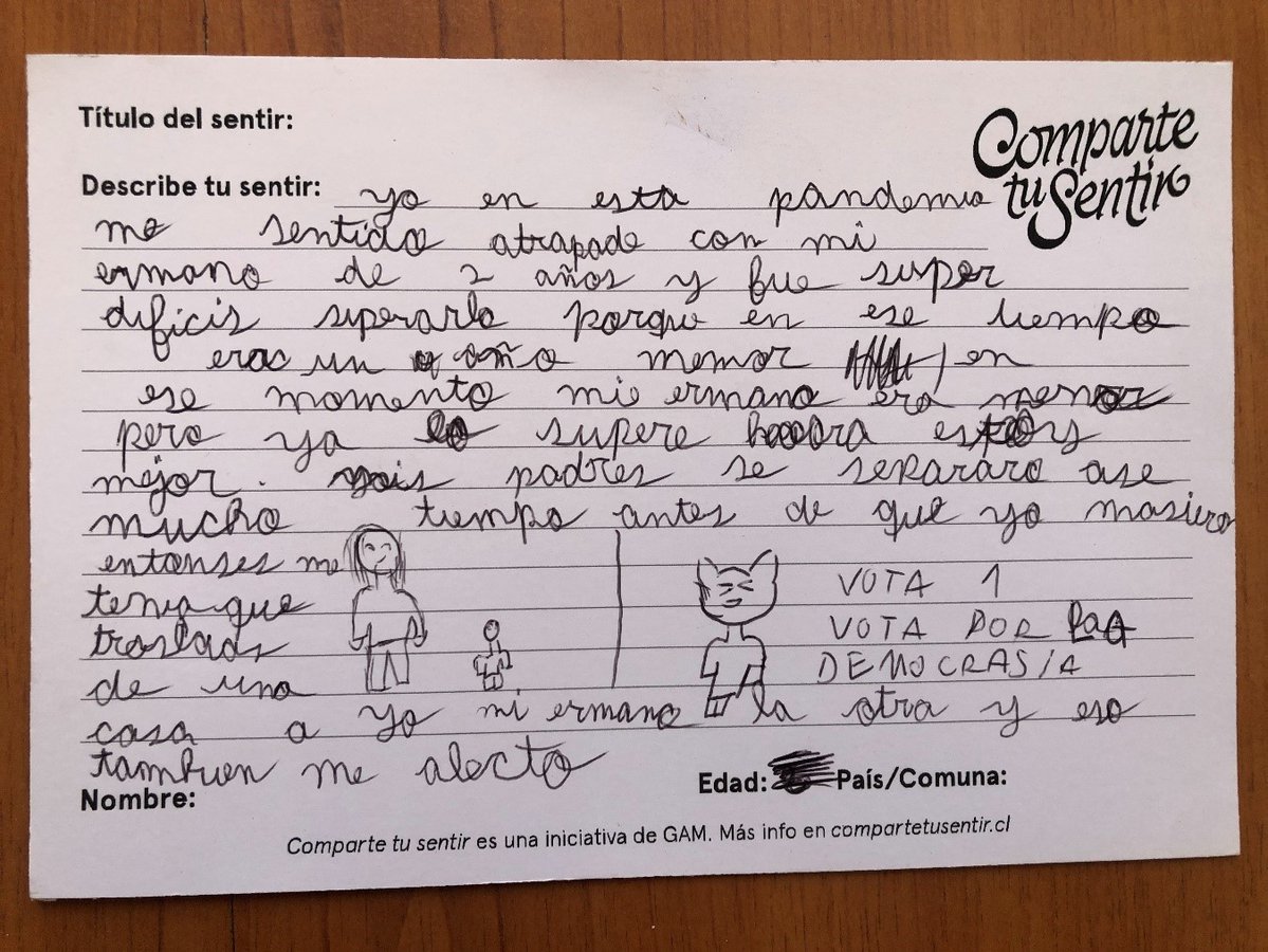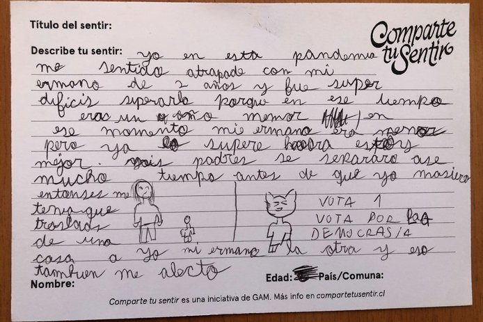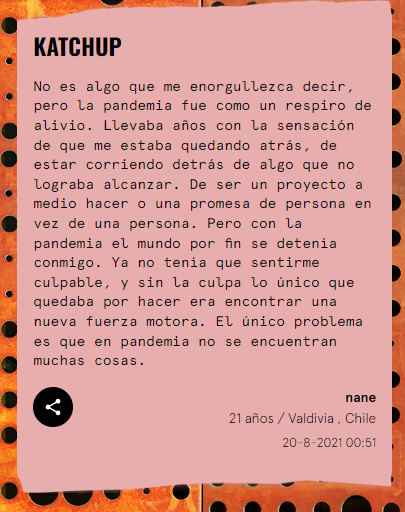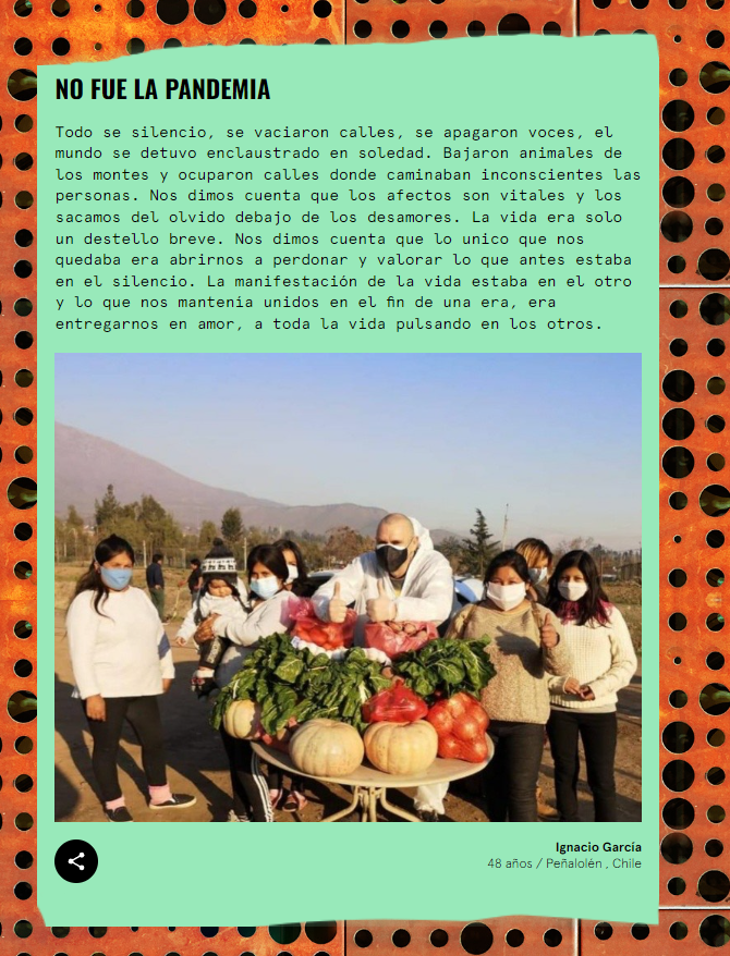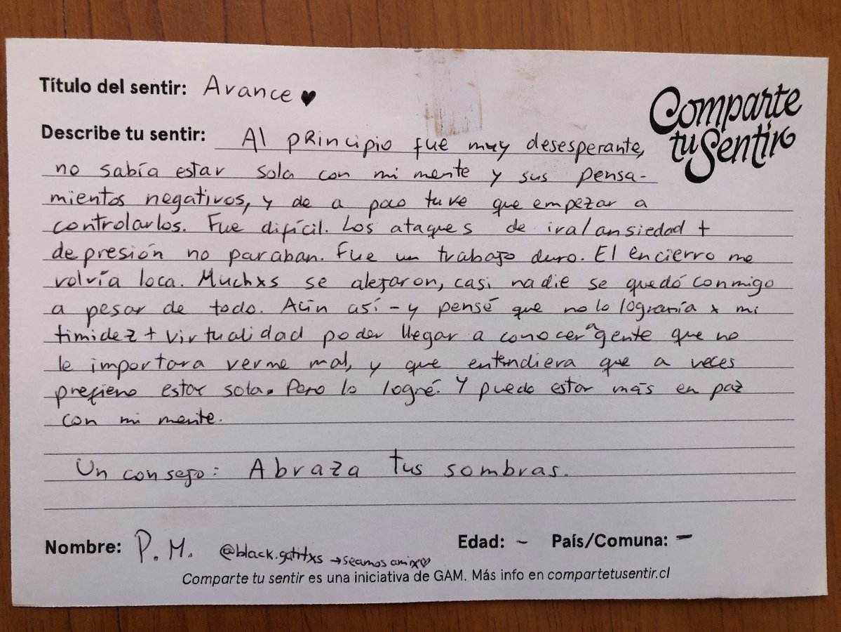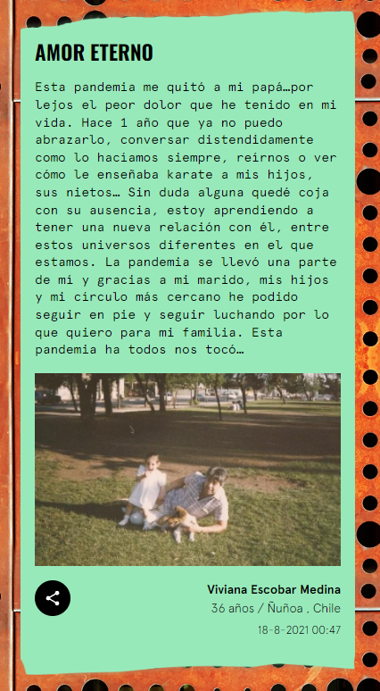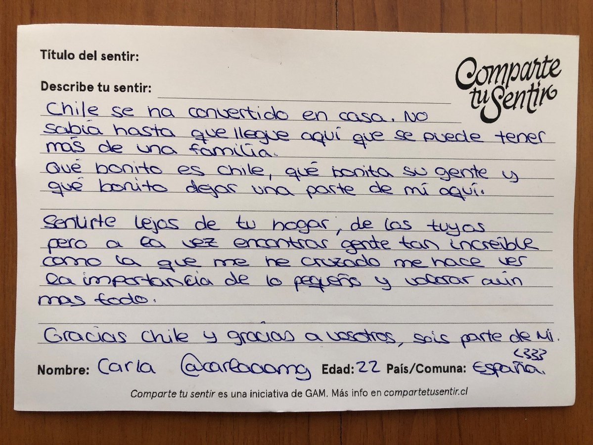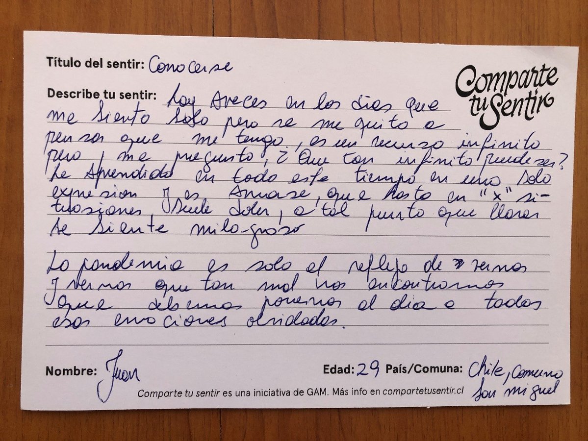 El sitio web se convirtió en un repositorio de historias, una invitación a desahogarnos con lo que no resultó, con los planes que no se pudieron realizar, con los encuentros pospuestos y las costumbres pausadas. También propuso difundir otras iniciativas de memoria Covid-19 y además, una playlist colaborativa en Spotify GAM. En un mes de campaña digital, se escribieron 52 mensajes siendo un 65,4% de ellos provenientes de Santiago, 11 de regiones y uno internacional.