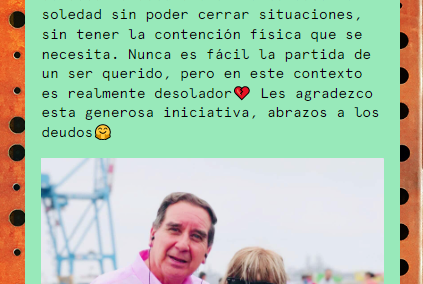 Ante esto, desde Comunicaciones se buscó dar cabida al dolor, al luto que parecía en suspensión por las medidas de aislamiento, a evitar dar vuelta la página. Se buscó generar un espacio de contención, crear una pausa para reconocer lo que nos había sucedido y poder comunicarlo; devolver a las personas una sociedad humana y acogedora frente a la tristeza. Validar el sentimiento del otro y abrazarlo nos permite construir una cultura empática que puede visualizar nuevas vidas desde las pérdidas.