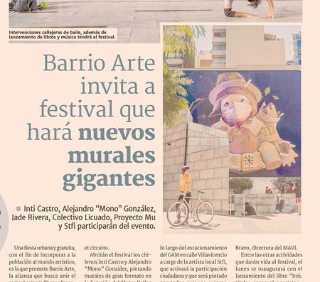 Los muralistas Inti Castro, Alejandro “Mono” González, Jade Rivera, Colectivo Licuado, Proyecto Mu y Stfi participarán del Festival Urbano Barrio Arte creando cinco murales a gran escala.