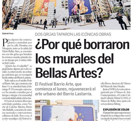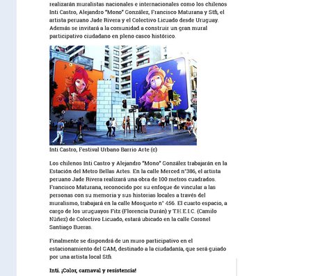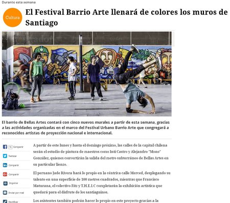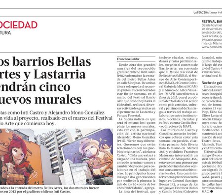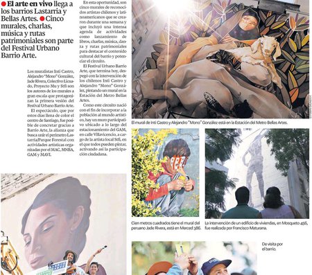 El Festival Urbano Barrio Arte despegará con la intervención de los chilenos Inti Castro y Alejandro “Mono” González, pintando murales de gran formato en la Estación del Metro Bellas Artes. En paralelo, el artista peruano Jade Rivera plasmará su creación en calle Merced #386 en 100 metros cuadrados. Otro mural será el de calle Mosqueto #456, donde Francisco Maturana intervendrá un edificio de vivienda con su característico estilo de vincular a las personas con su memoria y sus historias locales. El cuarto espacio, a cargo de los uruguayos Fitz (Florencia Duran) y T.H.E.I.C. (Camilo Núñez) de Colectivo Licuado, estará ubicado en la calle Coronel Santiago Bueras #142.