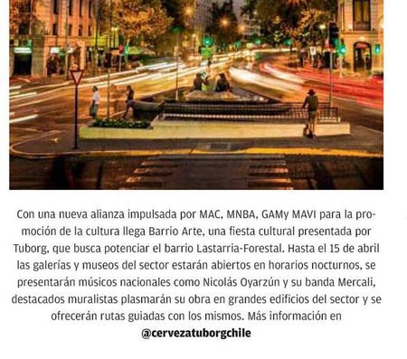 * Quienes participen en esta semana de arte y cultura, podrán disfrutar cerveza Tuborg en variadas actividades del Festival.