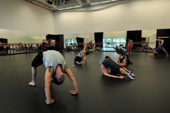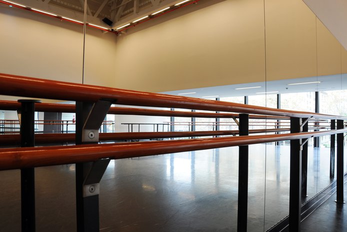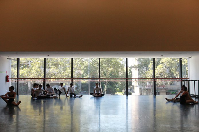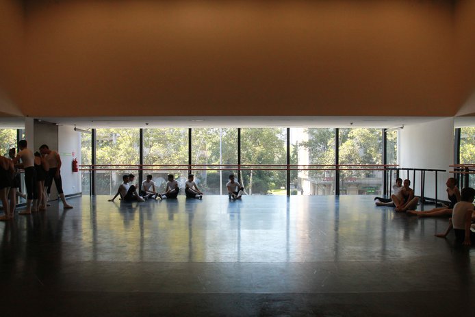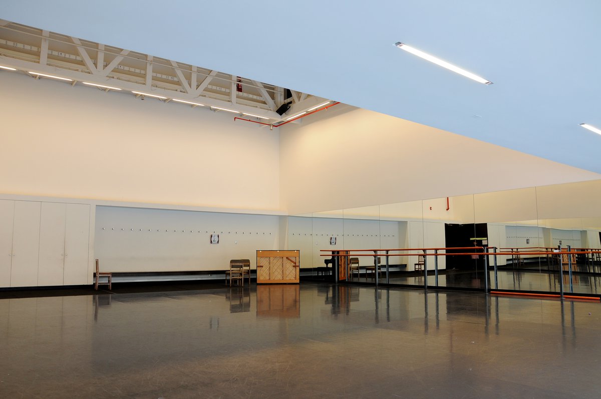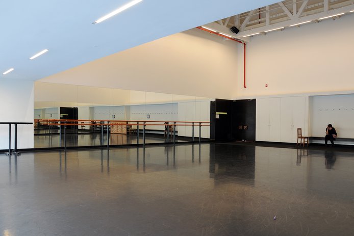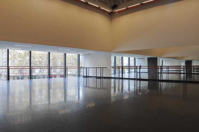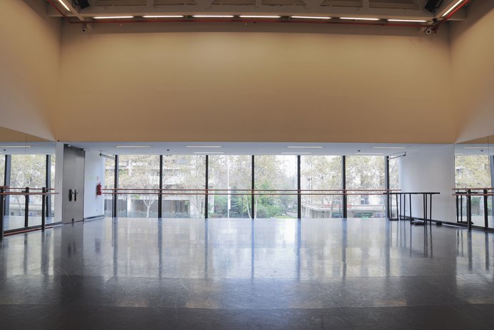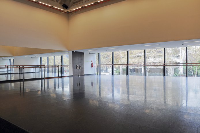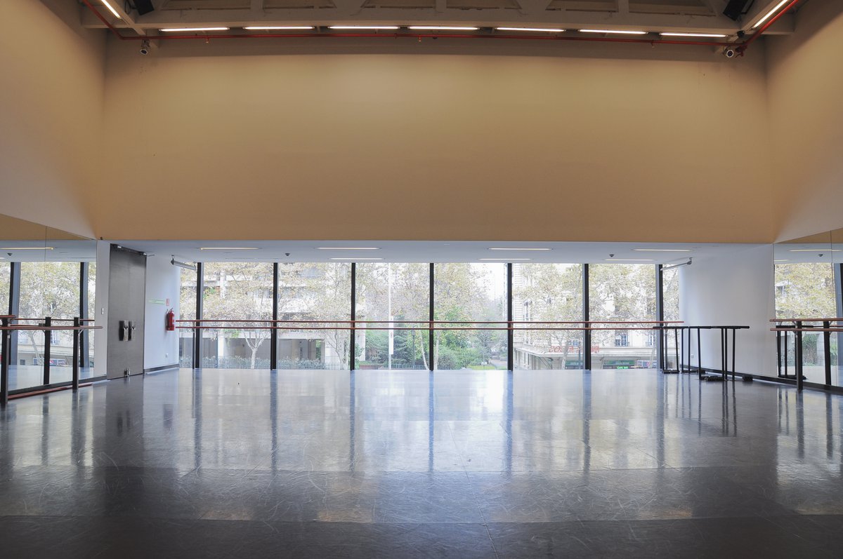La sala está revestida de espejos y piso de rebote especiales para la danza, y equipada con todo lo necesario para sonido e iluminación.