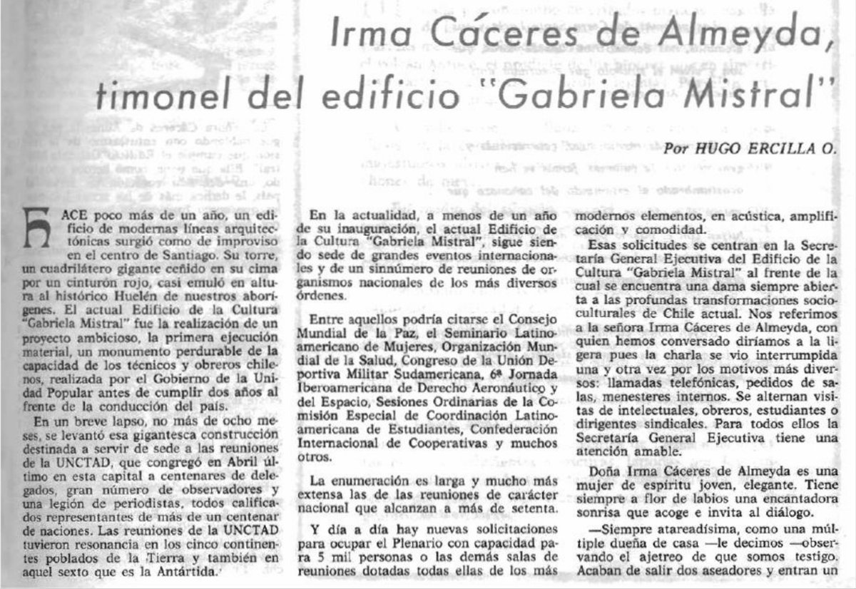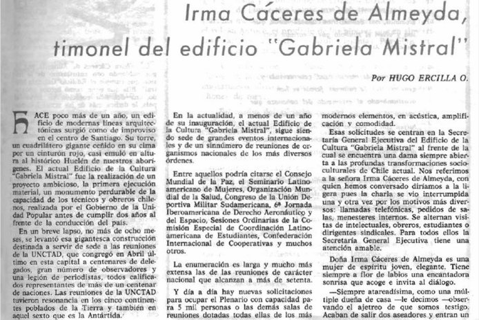 El Centro Metropolitano Gabriela Mistral se inauguró en septiembre de 1972 con un concierto de Quilapayún en la Alameda, y tuvo como directora a Irma Cáceres. Conocida como “la pequeña Lulú” en el mundo político por su carácter peleador, a sus 94 años, cuenta cómo fue realizar su gestión en una época en que las mujeres no solían tener cargos directivos.