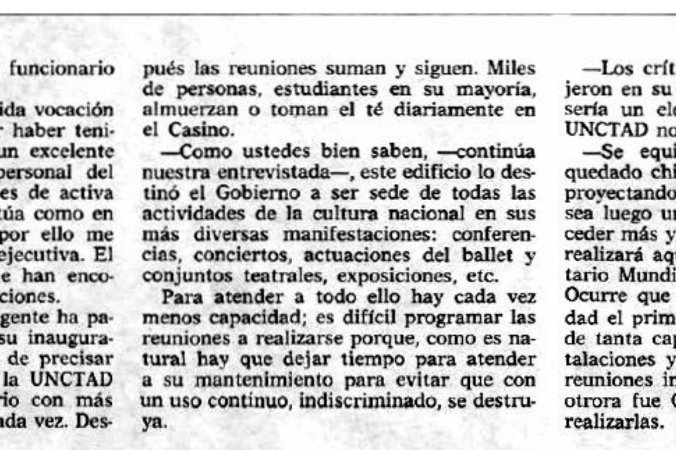 Sentada en su casa en Lo Cañas y con la mesa cubierta de fotografías en blanco y negro, quien fuera directora del Centro Metropolitano Gabriela Mistral, recuerda como se le devolvió el edificio a la ciudadanía post UNCTAD III. Era un museo abierto, un escenario para actividades culturales que además ofrecía un casino que acogía a 600 comensales. Fue el punto de encuentro de una sociedad efervescente hasta que lo comenzaron a apedrear.