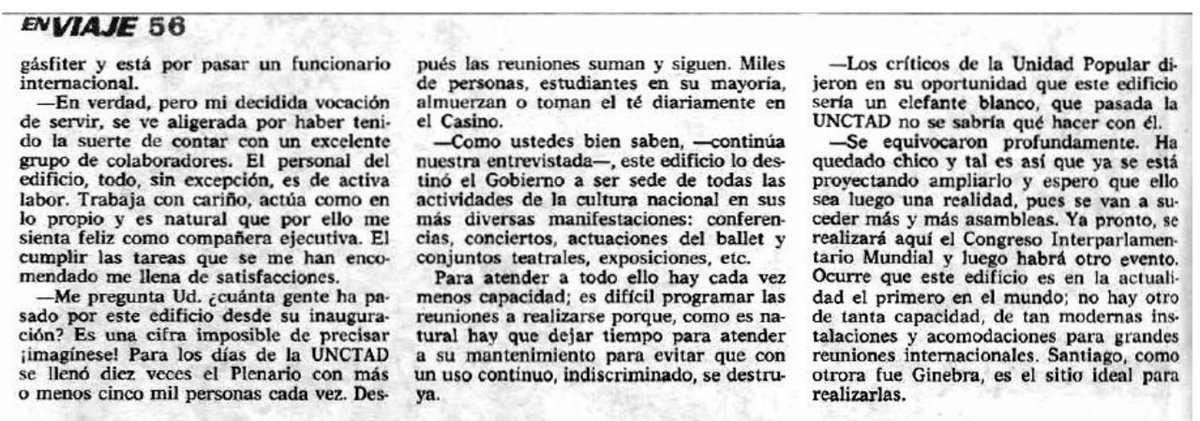 —¡Yo era tan feliz trabajando ahí! tenía la sensación que servía, que era necesario. Tener un trabajo que me permitía dar a conocer Chile, era realmente un privilegio. Darle entrada a una serie de gente que no tenía posibilidad en otras partes, de amplitud… se vivía, se trabajaba y se podía hacer mucho adentro —dice hoy, a sus 94 años.
