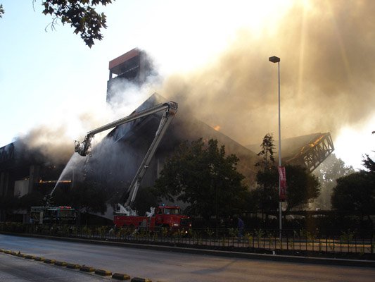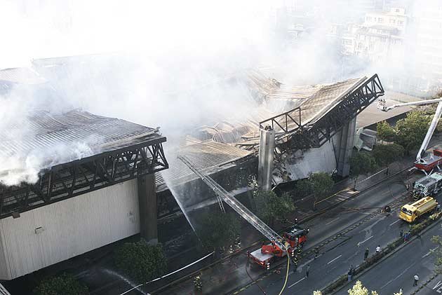 El gran salón plenario, con capacidad para dos mil personas, fue el espacio más afectado por el incendio que la tarde del 5 de marzo de 2006 destruyó el sector oriente del edificio. Un cuarenta por ciento de la construcción fue dañado, además de la destrucción parcial de los salones Blanco y Azul y el derrumbe de la estructura metálica del techo. El incendio movilizó a trescientos voluntarios del Cuerpo de Bomberos, cuyo informe oficial atribuyó el inicio del fuego a un recalentamiento en la red eléctrica del edificio.